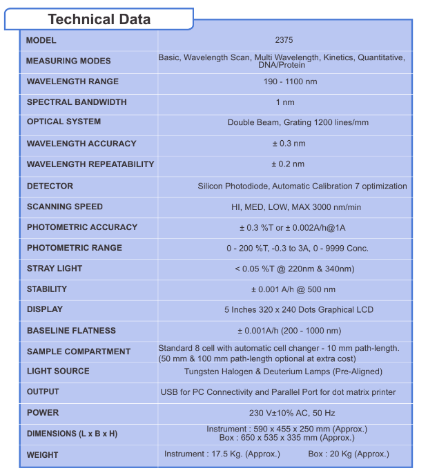 The instrument output is available in terms of % Transmission (%T), Absorbance (Abs.), & Concentration (Conc.).The instrument is suitable for clinical lab applications, pharmaceutical and biochemical, as well as routing applications such as quantitative analysis, kinetics, wavelength scan, multi-wavelength and DNA/Protein analysis.The instrument has sample storage memory and printer output port for printing of data with any dot matrix printer. The PC can be connected using the USB Interface. Provision for 8 position auto cell changer with 10 mm path-length cuvette is provided.