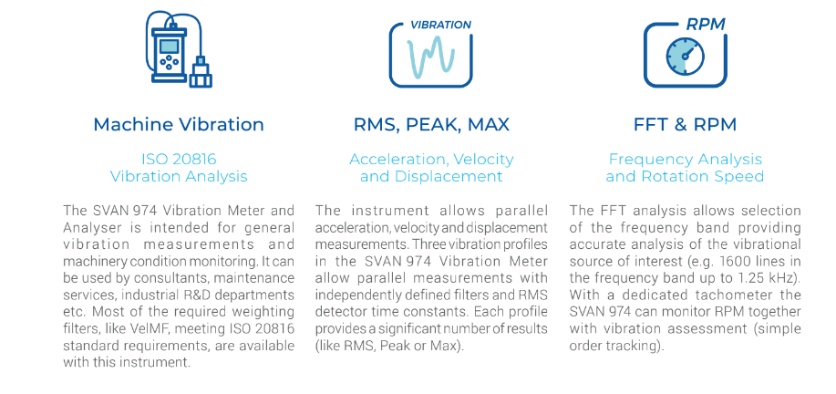 The SVAN 974 is a vibration level meter and analyser designed to measure vibrations from machinery. The instrument uses the SV 80 accelerometer, which is an ideal choice for walk-around vibration measurements in challenging industrial environments with heavy machinery, such as pumps, motors or fans. The flexible accelerometer input also supports different types of vibration sensors including IEPE, charge and direct.